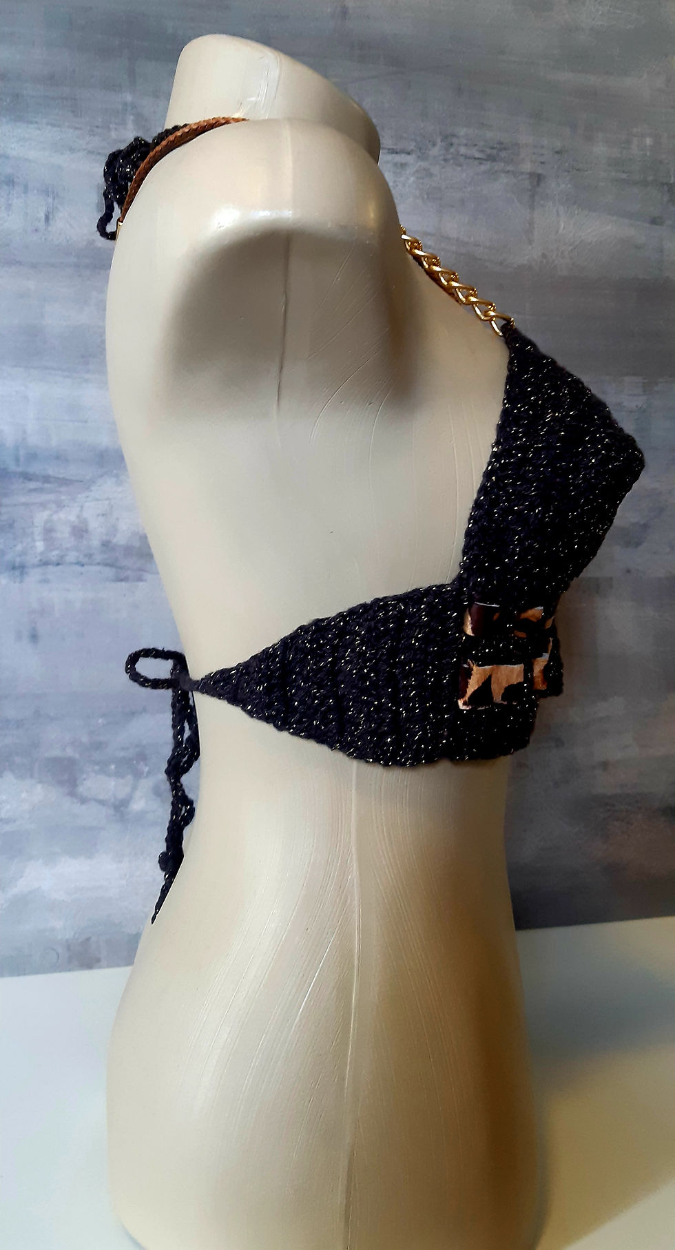 Blusa crochê amarelo mostarda couro camurça de cabra